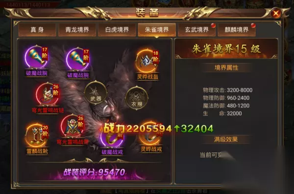 【朱雀境界说明】 1)角色等级达到400级开启朱雀境界。 2)朱雀境界可以穿戴26阶战装。 3)可使用朱雀魂魄来提升朱雀境界等级,等级越高可穿戴的战装阶数越高。 4)朱雀境界等级上限为15级,可穿戴40阶战装。 5)可通过帮会商城、合成系统来获取朱雀魂魄。