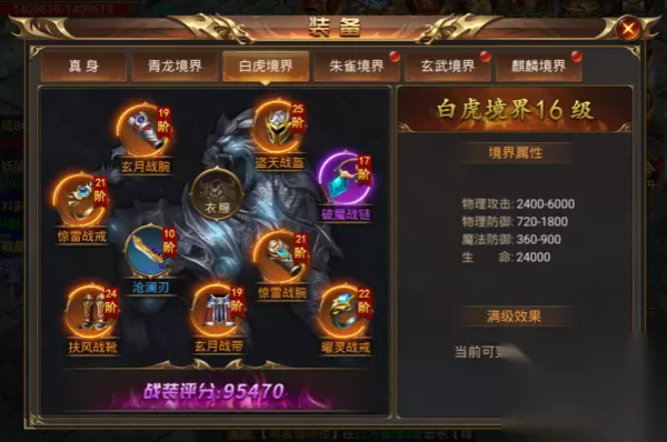 【白虎境界说明】 1)角色等级达到300级开启白虎境界。 2) 白虎境界可以穿戴25阶战装。 3)可使用白虎魂魄来提升白虎境界等级,等级越高可穿戴的战装阶数越高。 4)白虎境界等级上限为16级,可穿戴40阶战装。 5)可通过帮会商城、合成系统来获取白虎魂魄。 6)可通过击杀世界BOSS获得特戒碎片,使用特戒碎片来合成特戒。