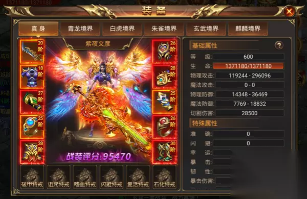 Ø 装备系统分为:真身、青龙境界、白虎境界、朱雀境界、玄武境界、麒麟境界。