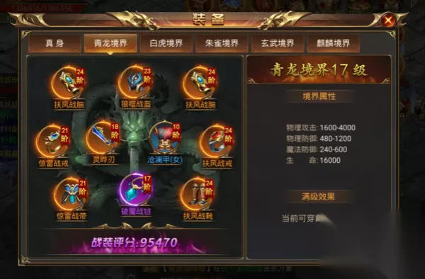 Ø 真身可以穿戴所有阶段的战装,还可以穿戴特戒。 Ø 通过提升角色等级来开启其他境界,每开启一个境界角色可以多穿一套战装。 Ø 对应的部位穿戴相同阶段的战装可以激活套装属性,额外增加角色攻击、防御和切割伤害。武器+衣服,手镯+戒指,头盔+项链,腰带+鞋子。 Ø 可通过击杀BOSS和龙族宝藏获得战装。 Ø 可通过击杀世界BOSS获得特戒碎片,使用特戒碎片来合成特戒。 【青龙境界说明】 1)角色等级达到230级开启青龙境界。 2)青龙境界可以穿戴24阶战装。 3)可使用青龙魂魄来提升青龙境界等级,等级越高可穿戴的战装阶数越高。 4)青龙境界等级上限为17级,可穿戴40阶战装。 5)可通过帮会商城和充值活动来获取青龙魂魄。