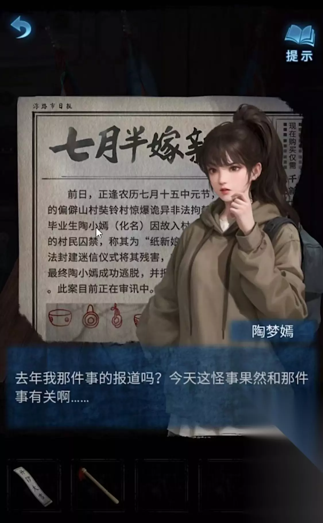 第五幕:梦焉。 这一幕的情节就是在讲述屠浮生借助戏剧院想要完成“陶梦嫣”的送嫁任务,但是在荀和钟的帮助下,这个任务再次破灭了。但是荀为了就陶受了伤导致魂魄再次分离。为下一次的故事做好了铺垫。本关的章节通过调节电视机获得线索,完成模魔方的小游戏,点亮北斗七星和华容道的游戏就能来到故事的结局。