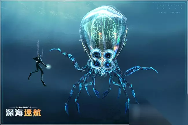 蟹鱿是大型侵略性掠食者,它们的身体由两层构成,半透明的膜装外皮和像果冻材质一般的身体。上半身形似地球上的鱿鱼,下半身却像螃蟹,有着十根棕色光滑却尖利的肢体。这些肢体有些是充当运动器官,有些是作为攻击器官,有着锋利的尖端或功能性的钳子。在狩猎行为中,蟹鱿通常慢悠悠的游荡到海底,装作没有什么攻击性的样子,在有其他生物接近时,会迅猛发动攻击。同时,在观察到弱小的鱼类或鱼群时,蟹鱿也会主动发起攻击并进食。与骨鲨类似,蟹鱿也经常会被光线吸引,这意味着你可以使用独眼巨人号的灯光转移它的注意。当然,这招用多了可能直接导致载具的照明系统被蟹鱿破坏。除此之外,蟹鱿还会发出响亮的声音来进行回声定位或同伴间的交流,这也给了我们提前发现它,做好提防的准备时间。 NO.7 踏浪者