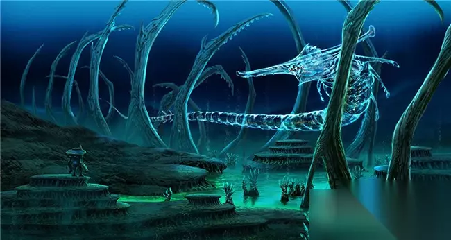 幽灵鳐经常在失落之河被发现,特点是其哀怨凄厉的叫声。体型很大,像地球上蝙蝠和鳐鱼两种生物的结合体。幽灵鳐整个身体都是半透明状的,观赏性很好,但配合失落之河绿色的海水和阴郁的气氛,幽灵鳐就让人觉得很诡异吓人。但幽灵鳐也是一种温顺的生物,其对于生态系统的作用大概就是装点环境,渲染氛围吧。 NO.9 电鳗