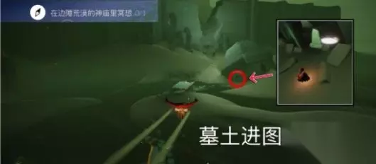 在光遇国服4月16日的日常任务中,有一项的要求是在边陲荒漠的神庙里冥想,许多玩家都不清楚具体的冥想点位置。 边陲荒漠神庙冥想位置: 在墓土初始图的倾斜小塔(神庙)里冥想 玩家们可以参考下图,就能够顺利找到此次冥想任务的地点了。 神庙就是墓土地图进图里的破房子,具体位置如图