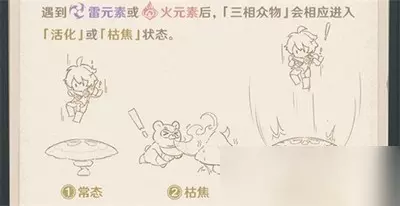 二、原神须弥三相众物形态介绍 1、常态 2、活化态:三相众物因雷元素活化时,会释放【真识波】,能使被藏匿的事物显现。 3、枯焦态:三相众物遇到火元素会进入枯焦状态,失去活性。
