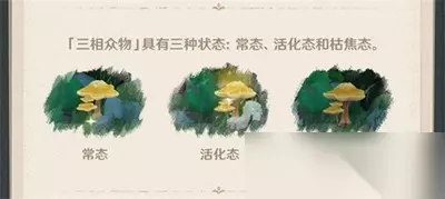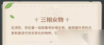原神须弥三相众物介绍一览 一、三相众物介绍 1、三相众物是须弥的一些附着奇妙增生物,能根据外界的元素刺激进行状态变化的物种。