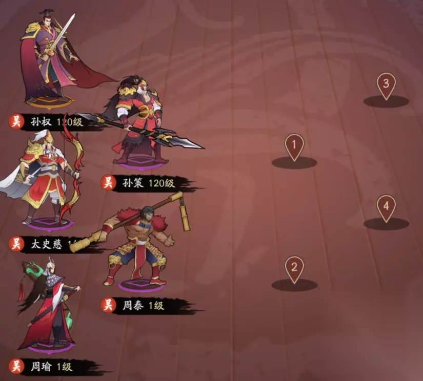 优点:赵云开场就会冲入敌阵、攻击对位敌人,刘备和姜维的小技能可以降低敌人的攻击力,诸葛亮和刘备都会奶人,姜维大招更是全体护盾、能最大限度地保证己方武将放出大招。加上黄忠的被动技能辅助,队伍的功效性非常强,通过有效的位置调换、以点破面,战胜对手。 缺点:前期技能不全或者等级不高时,赵云很可能有去无回。中期相当强势,姜维开出大招基本奠定胜局。后期会有些乏力,毕竟目前蜀国没有非常给力的aoe伤害武将,灭不了对方就可能会被对方灭。 【吴国】前排:孙策+周泰,后排:孙权+太史慈+周瑜。前排可用黄盖替换,后排可用孙尚香替换。