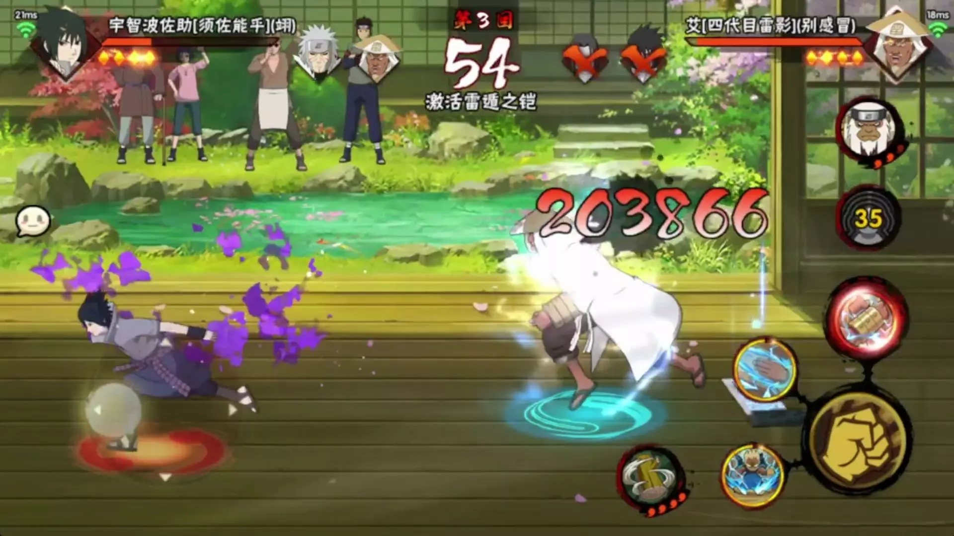 这是《火影忍者》手游的决斗场对战内容,展示了玩家操控不风、千手柱间[秽土转生]与对手的波风水门[百战]等忍者进行多回合对战的精彩过程,呈现了忍者技能释放等对战细节。