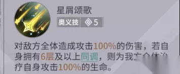 【奥义技】星屑颂歌:对敌方全体造成攻击100%的伤害,若自身拥有6层及以上同调,则为我方全体治疗自身攻击100%的生命。