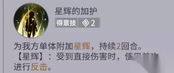 【得意技】星辉的加护:对我方单体附加星辉,持续2回合。【星辉】:受到直接伤害时,使用普攻进行反击。