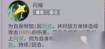 【普攻】闪耀:为自身附加1层同调,并对敌方单体造成攻击100%的伤害。若自身拥有4层及以上同调,则为自身附加攻击30%的护盾,持续2回合。