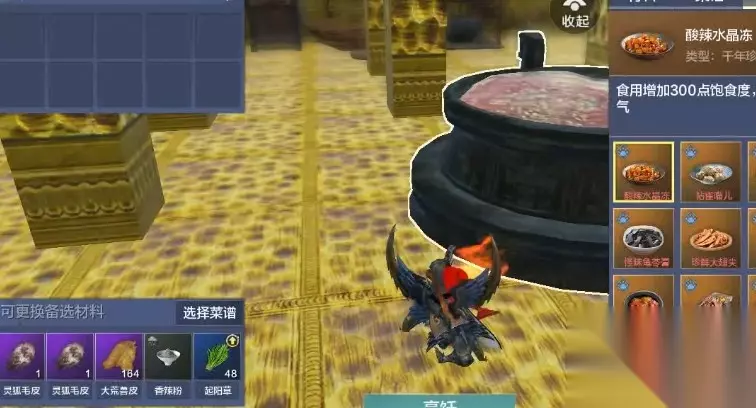 6、犀羚大乱炖:骨羊原神+骨羊原神+大荒兽皮+胡菜粉+胡菜 7、怪味龟苓膏:龟孽甲+龟孽甲+大荒兽皮+慈葱粉+起阳草。 8、烟熏当康肉:当康皮+当康皮+大荒兽皮+小兽肉+山蒜粉。 当然还有很多,持续更新。。。