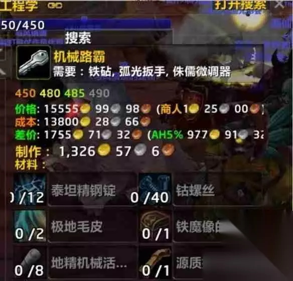 二、便捷之选:拍卖行购买 你不是工程师?或者觉得制作过程过于繁琐?拍卖行是你的最佳选择! 机械路霸在拍卖行中的价格通常在1.5万G到1.7万G之间,但会根据市场供需和材料价格波动。 建议关注拍卖行和世界频道信息,选择合适的价格入手。