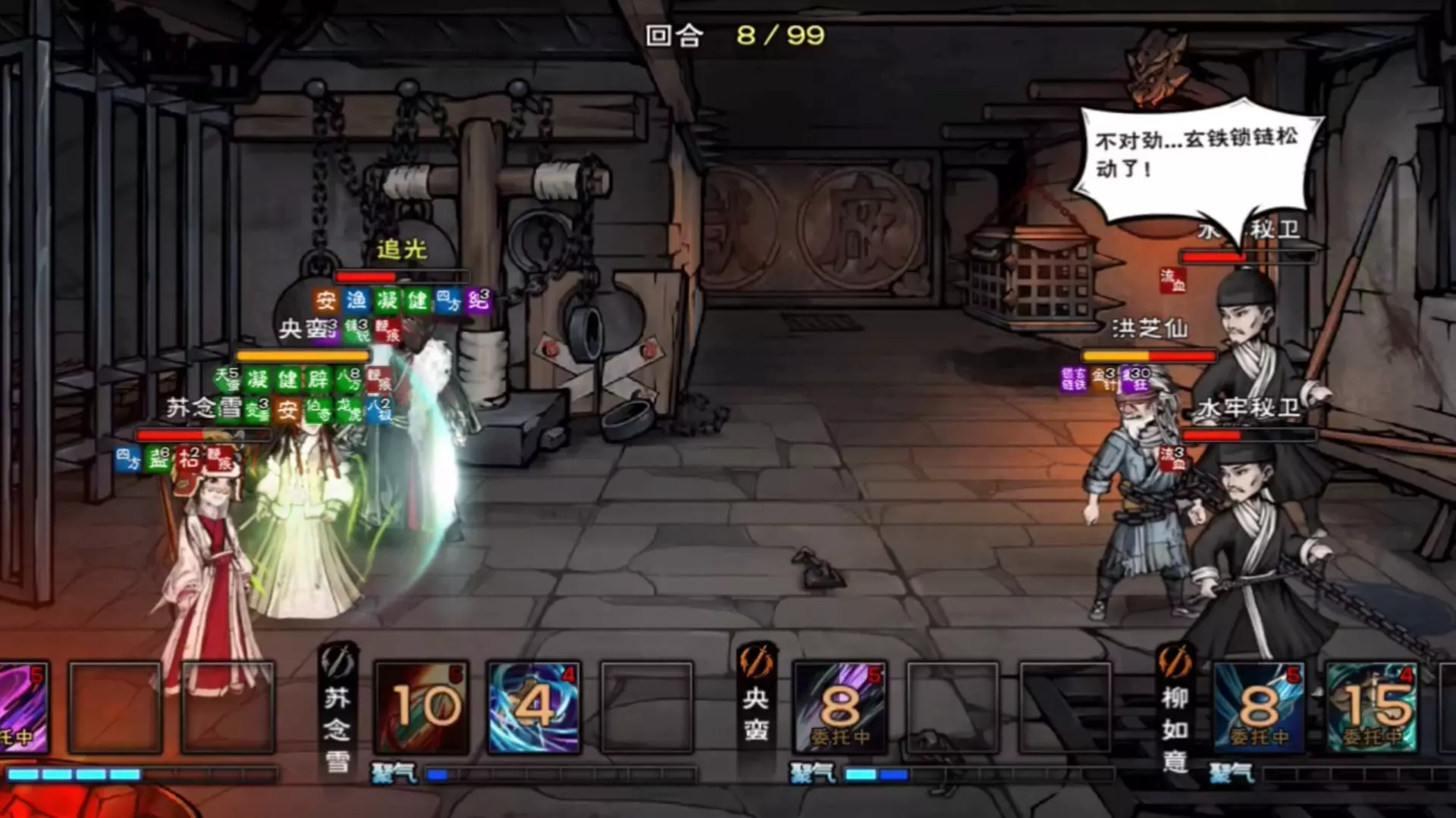 这是《烟雨江湖》54区月卡基金女拘开荒第153天的游戏实况,展示了玩家操控长离、萧佩吟等角色对战洪芝仙及水牢秘卫的战斗过程,战斗中出现玄铁锁链机制,角色释放星云一剑等招式展开对战。
