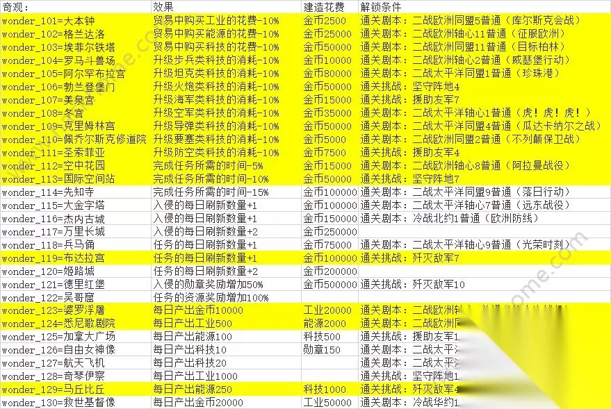 大本钟:贸易中购买工业的花费-10% 2500金币 通关剧本:二战欧洲同盟5普通(库尔斯会战) 格兰达洛:贸易中购买能源的花费-10% 25000金币 通关剧本:二战欧洲轴心11普通(征服欧洲) 埃菲尔铁塔:贸易中购买可以的花费-10% 50000金币 二战欧洲同盟11普通(目标柏林) 罗马斗兽场:升级步兵类科技的消耗-10% 10000金币 二战欧洲轴心2普通(威瑟堡行动) 阿尔罕布拉宫:升级坦克类科技的消耗-10% 80000金币 二战太平洋同盟1普通(珍珠港)