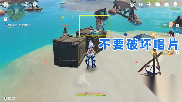 唱片就在营地中央木箱上,注意!不要击碎木箱因此建议: ①请立刻跑远,因为敌人攻击也能击碎,不要带召唤物(比如芙宁娜三小只会打碎木箱) ②不要使用范围技能,建议使用单体角色。