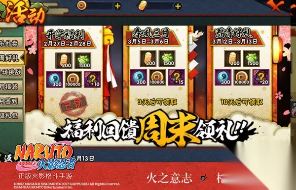 活动规则 1.等级达到20级及以上的忍者学员在活动期间每周末登录游戏,即可在活动中心的“周周好礼”活动界面领取好礼。 2.活动持续三个周末,2.27-2.28、3.5-3.6、3.12-3.13,在活动指定日期登录游戏才可领取对应奖励,过期和未到开放时间,奖励不可领取。 活动奖励: 3.5日-3.6日登录即可领取春风三月福利:金币*200、声望* 1500、铜币*100000、忍玉*300、随机B级忍者碎片*15; 3.12日-3.13日登录即可领取踏青好礼:金币*200、声望* 1500、铜币*100000、忍玉*300、随机B级忍者碎片*20 这是一份面向所有忍者学员发放的特别好礼,达到等级要求的学员们千万不要错过!