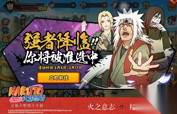 t15_2-t15_1:6.0 火影忍者漫动连载十五年,多少热血少年渴望化身为那些英雄忍者,在用战斗书写光辉传说?感应到忍者学员们的切热期盼,《火影忍者》手游于3月4日-17日开启限时强者降临活动,为学员们带来体验传奇忍者的机会——S、A、B级随机忍者限时免费操控。游戏中尚未加入招募阵营的四代风影波风水门亦在其中!同时,学员们参与传奇忍者体验活动,更可获得道具,兑换超多惊喜奖励!