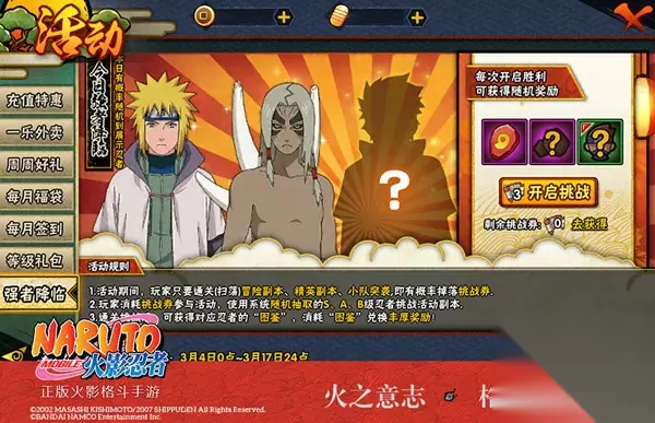 活动时间:3月4日00:00~3月17日24:00 活动范围:全服玩家 活动等级:20级及以上 活动规则: 1、活动期间,学员们通关(扫荡)冒险副本、精英副本、小队突袭,即有概率掉落挑战券。 2、学员消耗挑战券参与活动,使用系统随机抽取的S、A、B级忍者挑战活动副本。 3、通关挑战后,可获得对应忍者的“图鉴”,消耗图鉴兑换丰厚奖励。 活动奖励: 每次挑战胜利即可获得出战忍者图鉴、随机勾玉及轮回石奖励。 图鉴兑换奖励分为:C、B、A、S四个等级。使用单一忍者图鉴或集齐指定忍者图鉴组合即可兑换大量随机忍者碎片、声望、轮回石、铜币、勾玉等游戏内珍贵道具。