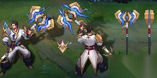 2、Zeus——杰斯 这款皮肤受到很多网友的吐槽,皮肤看上去很呆板,有点像是拳皇的感觉,且杰斯的主色系感觉更像是金色;回城动作则是地上升起5团雷电光环,杰斯在光环中回城。