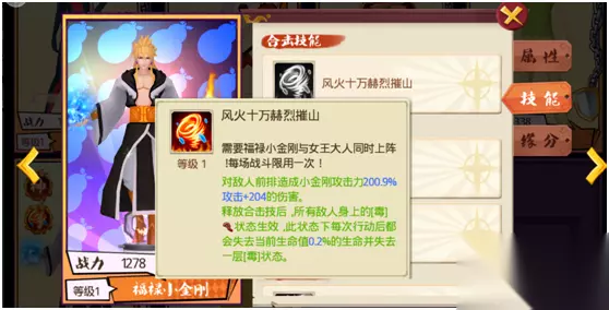 小金刚+女王大人 女王大人作为一个“一元就送”的伙伴,因为其极易的培养度和高强的资质,已经是绝大部分玩家的宠儿,作为版本之子,她的合击技能当然要放在最后一个介绍啦! 技能简介: 风火十万赫烈摧山:对敌方前排全体造成一定伤害,释放技能后,所有敌人身上的毒技能生效,每次行动时都会失去当前生命值0.2(+0.2/级)%的生命值,并且失去一层毒状态。 注:女王大人的普通攻击有几率使敌方单位获得毒状态,当女王大人生命值降低一定百分比的时候,敌方全员都会获得一层毒状态。