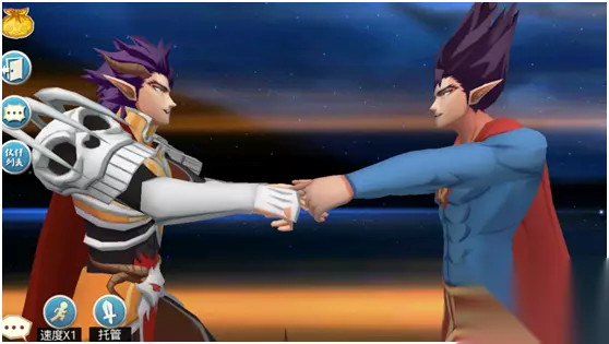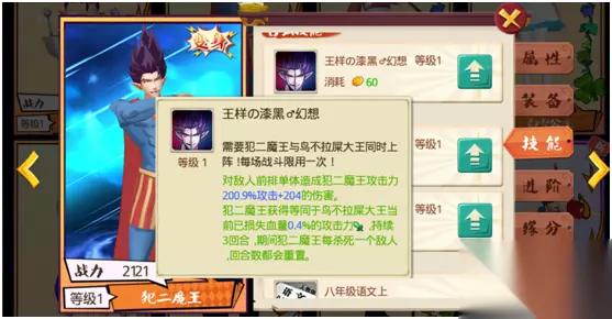 技能分析: 和黄飞鸿霍元甲一样,这个合体技能也是一个“前排遭罪后排享福”的好技能,因此需要在鸟不拉屎大王的生命值尽量压低的前提下使用,以让犯二魔王获得最大的攻击力收益。