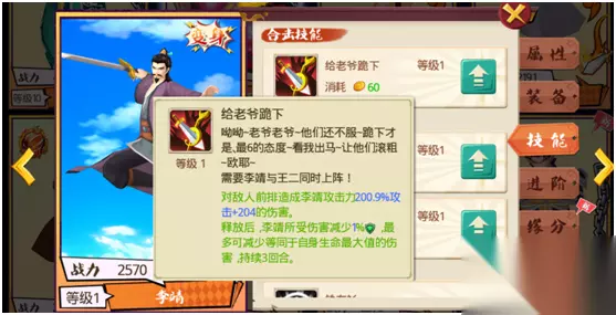 王二+李靖 王二+李靖,这是玩家在进入游戏后看到的第一个合击技能,两者的酷炫合击想必早已给大家留下了不小印象。不过这个技能的强度究竟如何呢?让我们来看看吧~ 技能简介: 给老爷跪下:对敌方前排全体造成一定伤害,并且使李靖受到的伤害减少1(+1/级)%,最多可减少相当于其最大生命值的伤害。