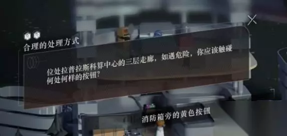 5、位处拉普拉斯科算中心的三层走廊,如遇危险,你应该触碰何处何样的按钮? 答案:消防箱旁的黄色按钮