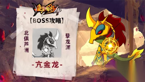 BOSS名称:亢金龙 BOSS简介:东方青龙星宿之一,本体为上古蛟龙,修炼数千年化作人形,掌控火焰神威。电巫以蛟龙族长龙尸胁迫亢金龙助其镇守一方 出没地点:孽龙渊 BOSS技能: >龙闪光:朝目标射出一道极细极长的金色光芒,击退目标并造成伤害(生命低于70%施放)
