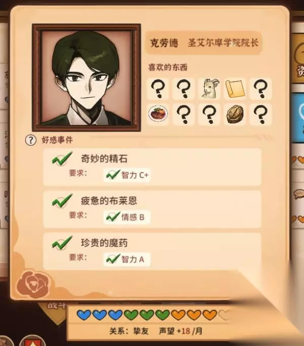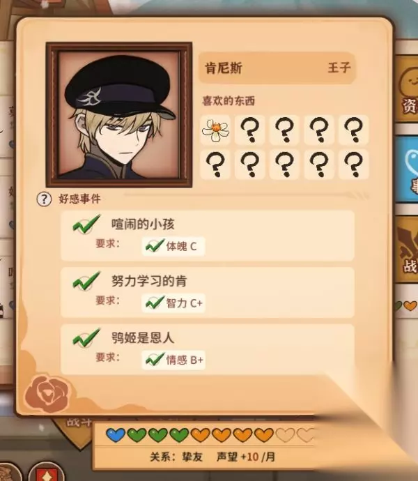 一、好感事件触发要点 1、关系认识解锁第一个好感事件,关系朋友解锁第二个,关系挚友解锁第三个。 2、重要NPC有四维属性要求,达到要求后会在每月初来家门口找女儿,一个月只能触发一个。