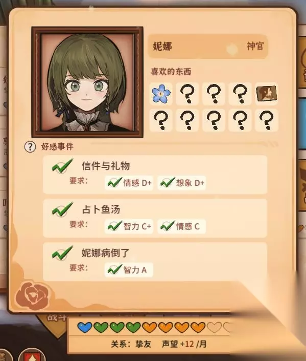 二、全角色好感事件要求一览 1、妮娜 全解锁需要智力达到A,情感达到C,想象达到D+