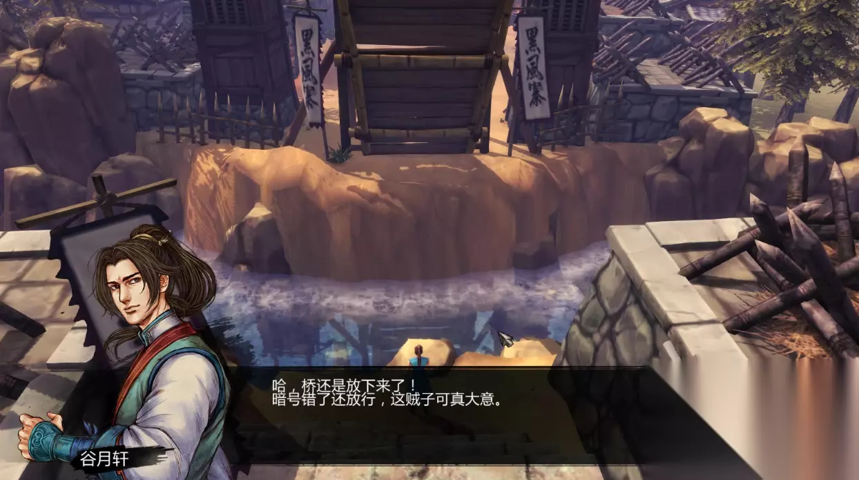 一、黑风寨攻略 第87日,师父听闻江湖传言,外面有个黑风寨近期危害百姓安宁。差遣主角和谷月轩2人前去讨伐黑风寨。2人来到阴山黑风寨前,这里可以选择先观察一下还是直接冲进去,冲进去触发战斗,选择观察可以触发剧情,等守卫出来巡逻,从后方慢慢靠近可以不用战斗直接拿下敌人。 解决守卫后,来到门前,这里再次选择冲进去还是寻找开关,开关在下图的位置。 触发这个开关后主角需要走到门的另一侧。2人同时按下开关即可开门。 进入黑风寨后,先左转,会碰到一个杂兵,对话能够逼问出通过吊桥的暗号,然后再去正面的吊桥,喊出暗号即可让里面的人放下吊桥。