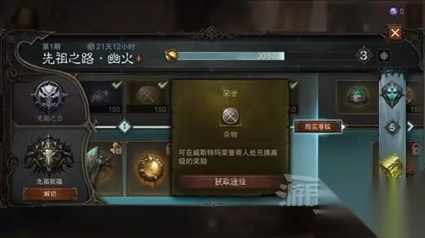 先祖之路(通行证) 在上方的先祖之力这一栏中,达到特定等级就可以获得荣誉,而且将通行证升到满级后,还能获得额外的荣誉。 每周获得2400先祖印记,即可获得1300荣誉。