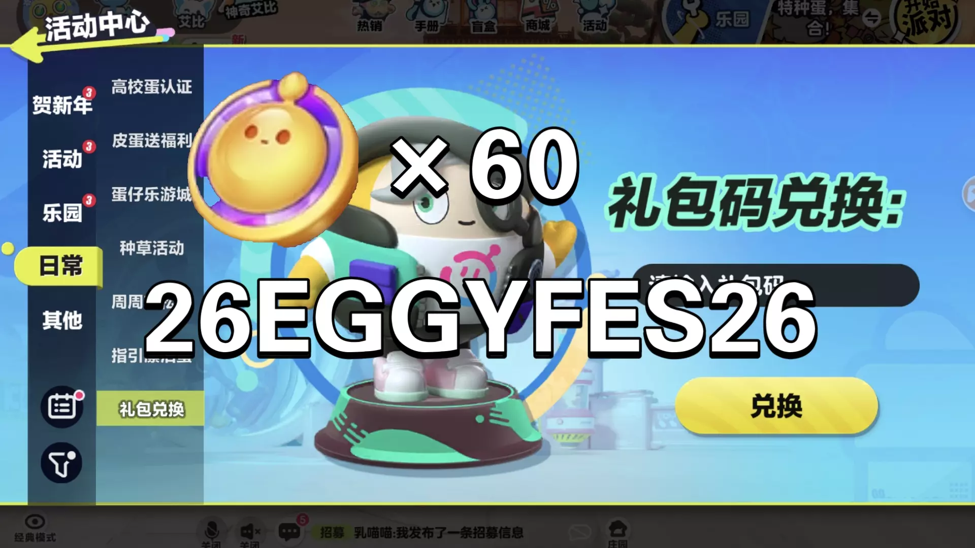 蛋币兑换码2024最新 eggyeggy666 eggy88888888 dzpd88888888 dzpd666666 dzpd666 dzpd888 vip999 7KFRL1WQAOKJNPOP GJOPNMG6V7SUJKOX RMPECXMSQTFJXLXAV KWCJNTSBC0HEAYE6 XM3MEESLWTQE 4PNIXKH6FN5RRA9T T2JP5HFE53UA FS6AW6J8B4C6 RRTKU6ENSOITQFOBL 使用方法 1、登录游戏之后点击页面上方的活动按钮,进入新页面点击礼包码兑换。