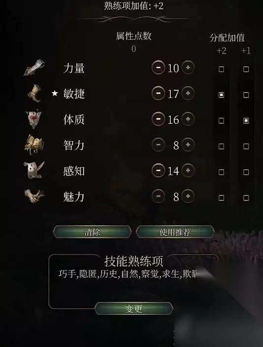 属性我们将敏捷点到17,体质16,其余按下面分配即可。