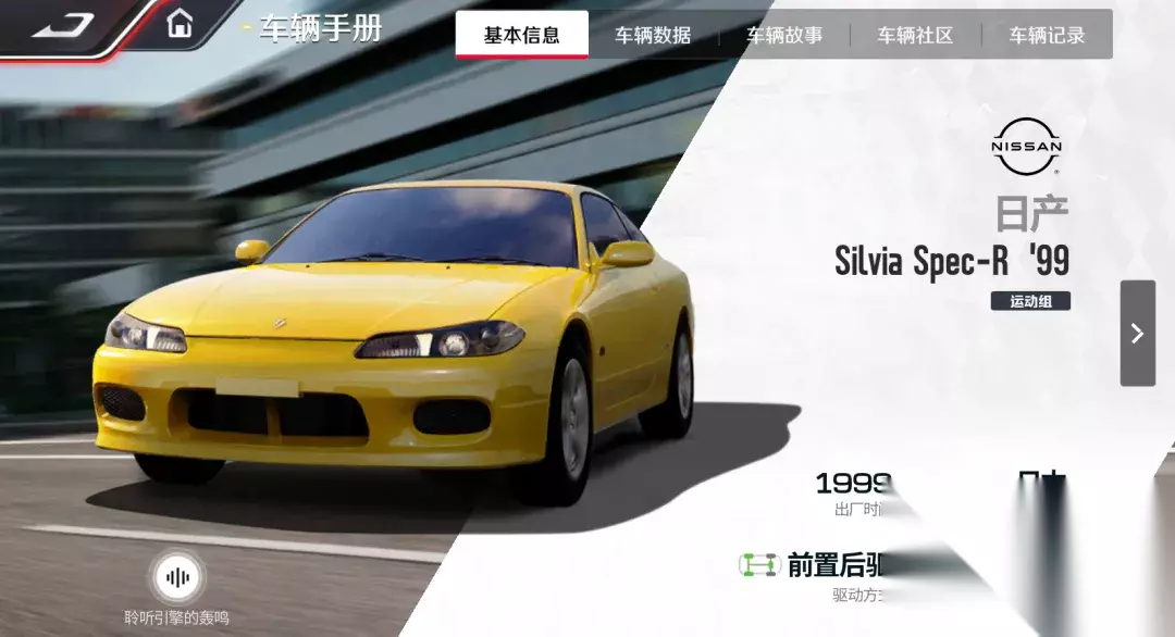 日产Silvia是日产自1965年起开始生产的前置后轮驱动跑车系列,游戏中收录的底盘代号为S15的Silvia Spec-R '99,则是家族中的最后一代车型。除官方名称外,还被车迷称为“最美飞鸡”和“漂移皇后”! 与前辈车型相比,日产Silvia Spec-R有着更加符合现代审美的外观设计,修长的车身搭配流线动感车体线条,营造出了车系前所未有的跑车风范,经过精心调整的精神车灯,与流畅的车身线条产生共鸣,让这台经典的车型简洁又不失运动气息。