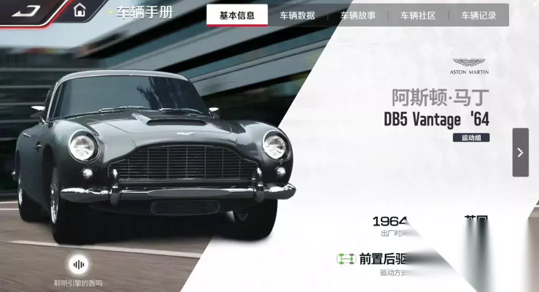 在《巅峰极速》中这台DB5并没有搭载武器。图片 作为1960年代最经典的GT车型之一,该车在全球只有约70台的产量,它将英国的工程技术与精美的设计合二为一,既拥有贵族优雅的外观设计,还拥有着不俗的赛道表现力。前脸是阿斯顿·马丁家族经典的镀铬大嘴式中网,采用了运动的溜背式造型设计,整体线条圆润优雅,散发着贵族的气息。如此经典车身设计,放到现在也是让人难以忘怀。 而这辆优雅到极致的车辆,将作为《巅峰极速》中第二台合约传奇车型,上线S4赛季全新合约当中,解锁合约奖励即可获得! 拿下这台极速和漂移能力兼具的车型,相信各位车手会像电影中的特工一样,优雅又实力超群!