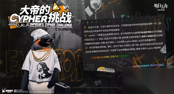 明日方舟题材新颖,在游戏剧情方面设计科幻感十足,随着剧情的一步步发展,风格变得与众不同,这一点非常的吸引玩家,其中每个人物的美术设计都符合玩家们的xp,服装上都充满了各种细节,将人物的个性特点都表现出来了,不肝不氪基本都能体验到游戏的乐趣,这也是这款游戏受玩家们欢迎的特点之一。明日方舟游戏中开启了一个最新的活动玩法大帝的挑战,这次的活动是网页的方式进行参与,参加活动的玩家有机会能够获得3万龙门币的奖励,奖励非常的吸引人,接下来为大家介绍一下明日方舟大帝的挑战活动一览。 明日方舟大帝的挑战活动一览 《大帝的CYPHER挑战》现已正式开启! 活动时间: 10月27日16:00~11月15日03:59 参与地址: YO这里是你的说唱皇帝AKA大帝 都知道我的足迹遍布这片大地 识人阅人的本领就属我无人能敌 不服就来一场火眼金睛的游戏 Calm down哪怕你会被难度调戏 Come on快让我见证那超越一切的勇气