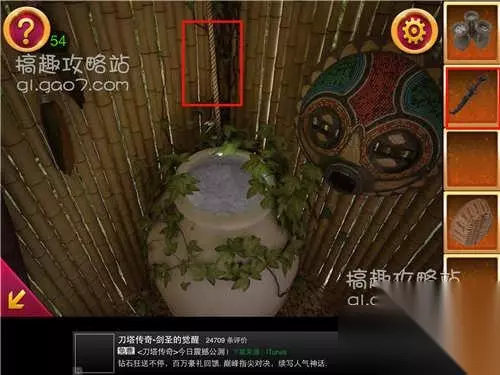 在刚才那个装满砂石的罐子后面,用刀把绳子切断。