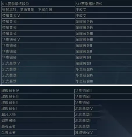 英雄联盟手游段位继承规则是什么 1、坚韧黑铁、英勇黄铜、不屈白银:不改变。 2、荣耀黄金IV:不改变。 3、荣耀黄金III:荣耀黄金IV。 4、荣耀黄金II:荣耀黄金IV。 5、荣耀黄金I:荣耀黄金III。 6、华贵铂金IV:荣耀黄金III。 7、华贵铂金III:荣耀黄金II。 8、华贵铂金II:荣耀黄金II。 9、华贵铂金I:荣耀黄金I。 10、流光翡翠IV:荣耀黄金I。 11、流光翡翠III:华贵铂金IV。 12、流光翡翠II:华贵铂金IV。 13、流光翡翠I:华贵铂金III。 14、璀璨钻石IV:华贵铂金III。 15、璀璨钻石III:华贵铂金II。 16、璀璨钻石II:华贵铂金I。 17、璀璨钻石I:流光翡翠IV。 18、超凡大师:流光翡翠III。 19、傲世宗师:流光翡翠II。 20、最强王者:流光翡翠I。 21、至尊王者:璀璨钻石IV。