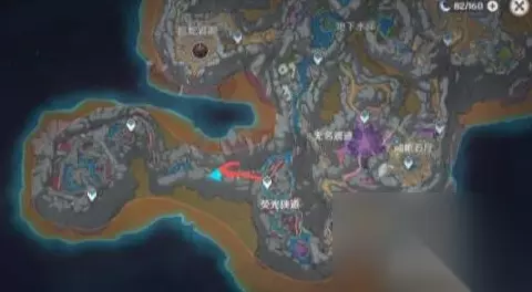 方法二:地图中获得 1、我们从崎岖石厅右上角的传送锚点往南方向看,如图所示位置,即可看到流明石原矿。