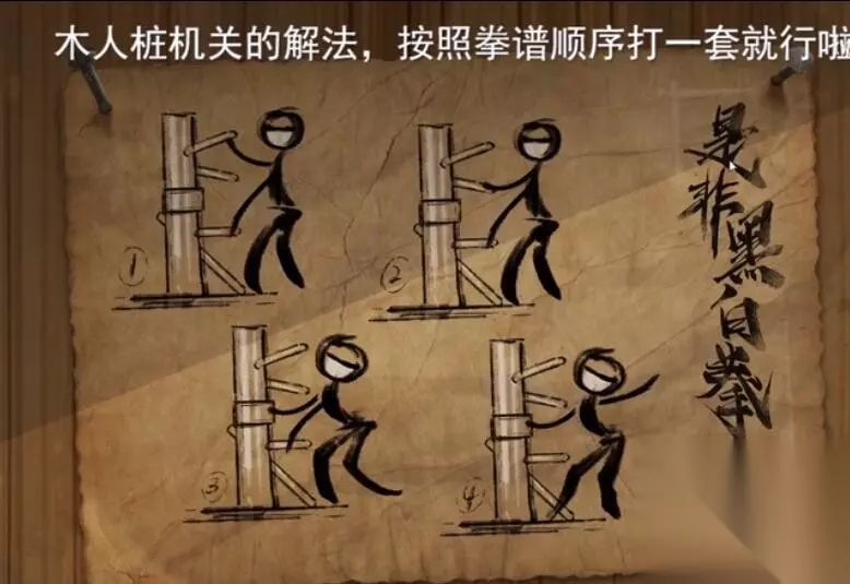 5、随后点击赶到英雄师傅的屋子,把右侧的鬼木柜开启,密码为《魂斗罗》中30命,来来回回左右左右BABA,完了以后拿到门把和线索。 6、把门把装进办公室后边的窗子,拿到了绳索。 第三关通关攻略 1、这儿木人桩的解法是:依照拳谱次序打一套即可!得到松动木材