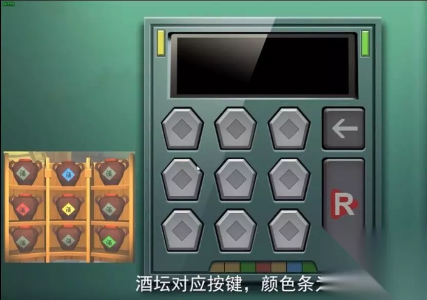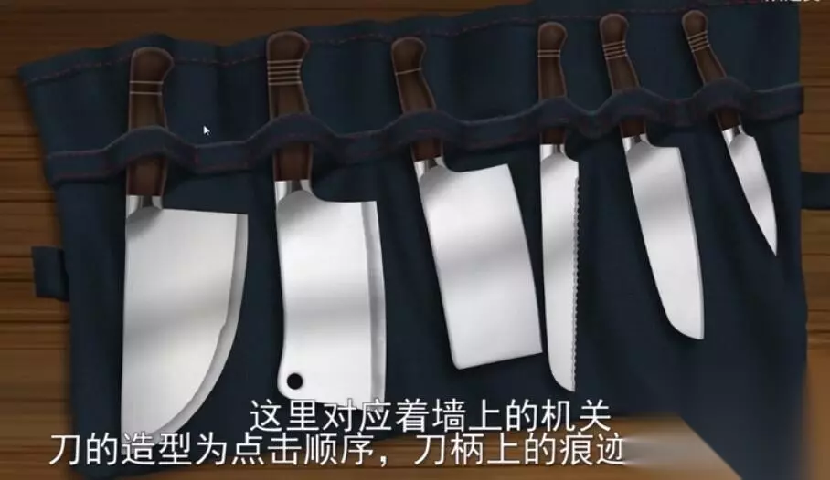 3、在左边的桌上大家拿到一个空罐,以后查询线索刀具的排列方式,把墙壁上刀具排序好。 这儿刀具造型为点击次序,筒夹里的印痕为点击频次 成功之后打开一道暗门