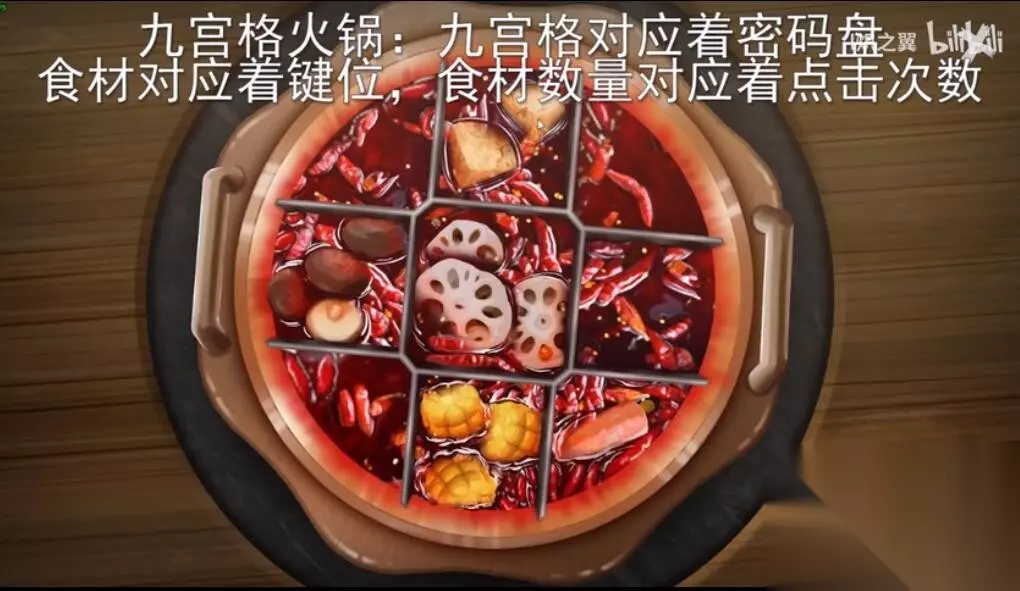 2、火锅里的九宫格对应密码盘,食物对应着按键,食物总数对应着点击频次