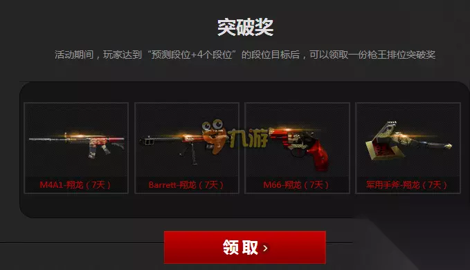 突破奖——活动期间,玩家达到“预测段位+4个段位”的段位目标后,可以领取一份枪王排位突破奖