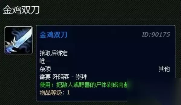 魔兽世界金鸡双刀要怎么获得 作用介绍: 金鸡双刀:刀子效果:用刀狂砍尸体,实际效果,和谐后为狂砍面包。