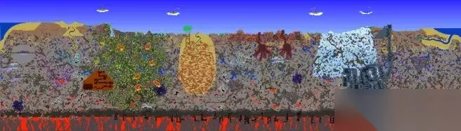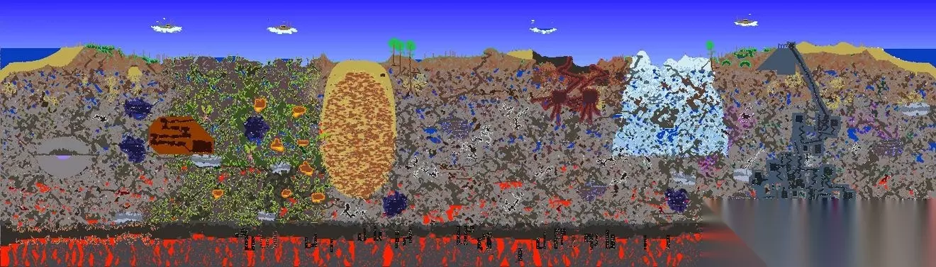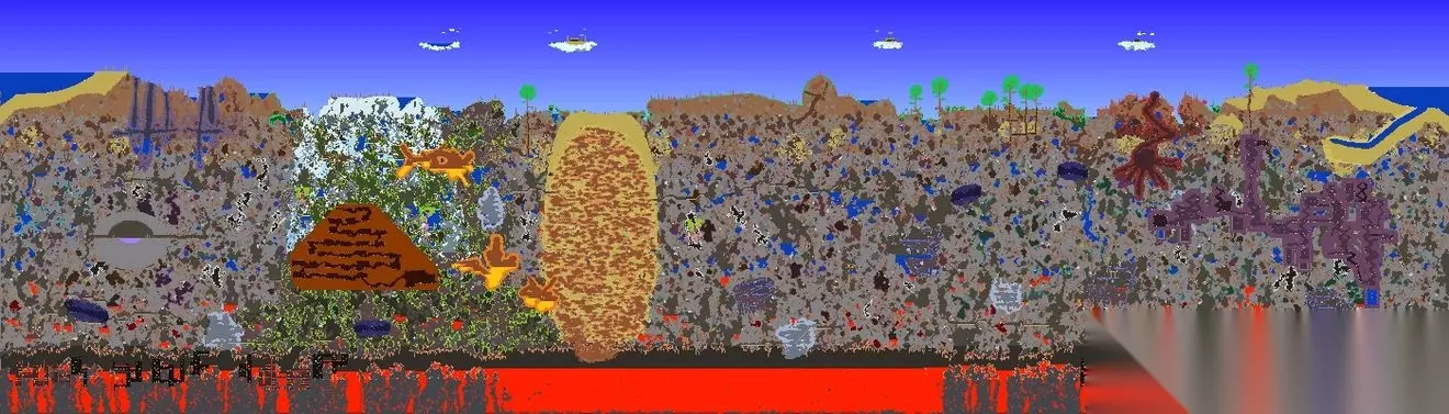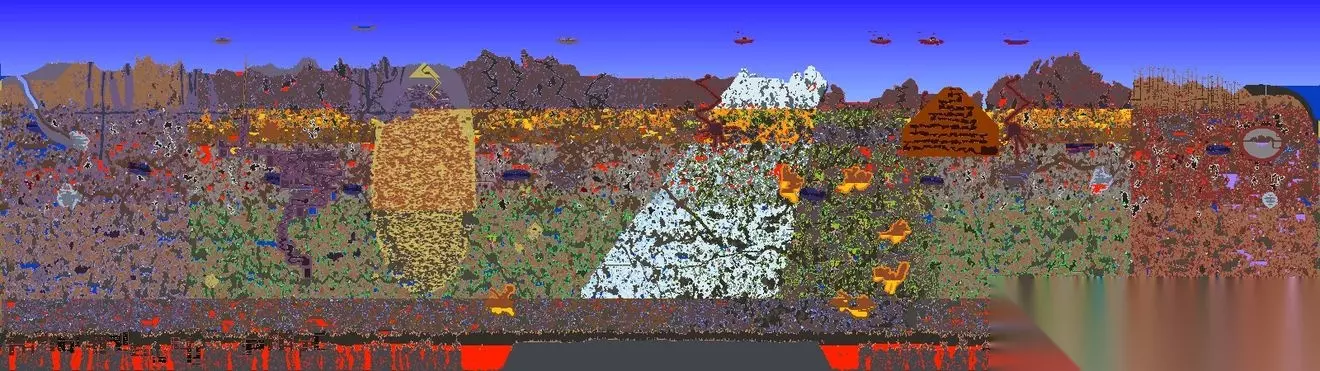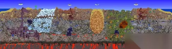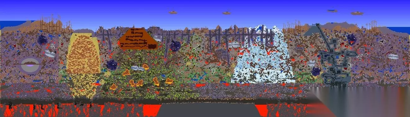 本彩蛋图为1.4.4全新彩蛋图 世界特性: 创建地图界面的泰拉瑞亚logo会倒置 并且背景始终为黑色星空,该世界的地表全部被邪恶环境所感染 并且此世界的时间永远为夜晚,世界位于倒置若到达太空顶层时会强制死亡,地狱层上面是夜光蘑菇地再上一层则是存在草地,树木,向日葵的地下层,随后便进入洞穴层,神庙会生成在地表高度npc没有幸福度机制,所有商品价格正常但是也会出售对应环境的晶塔