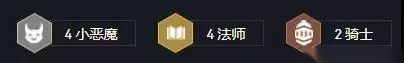 4恶魔:恶魔们获得30%攻速加持。当小恶魔们被击杀,会有一个“次级小恶魔”从传送门跳出并加入战斗。 4法师:法师们获得35法术强度。每当队伍里一名单位释放技能都会获得4法术强度,这个叠加没有上限。 2骑士:所有友军固定格挡20点伤害。