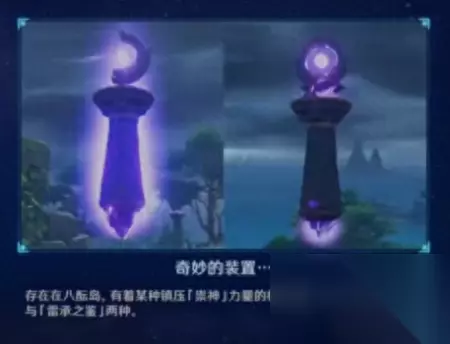 什么“御引磐座”,什么“雷承之鉴”我们不看,我就直接告诉你, ↑图片里,左边这个,能发射炮弹。你用什么攻击打它一下都行,它就会发射炮弹,它的炮弹打中了那个蓝色的罩子,罩子就会破掉。 右边这种装置,是反射炮弹用的。能用来调整角度。 然后,我们直接来看这个个镇物周围的装置。