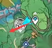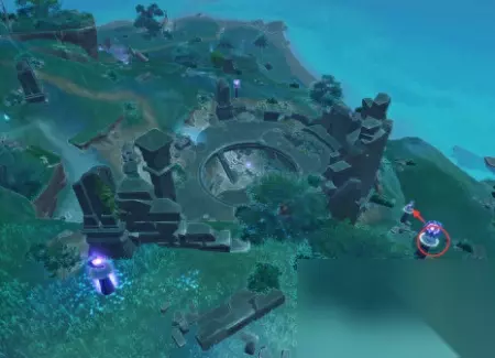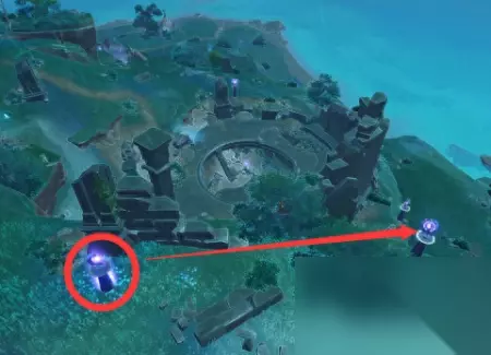 左边有个需要雷元素点亮的方碑,点亮一下。中间画红圈儿的地方有一块儿石头,是镇物要用的石头,记得拿走。右边有一个雷种子,拾取雷种子之后,你就能直接上去,不用再自己爬了。 还有引路的仙灵,记得送回去。 注意,你用雷种子出来之后,出口是在山坡上。这个地方有一堆冰丘丘射手在等着你。因为是雷雨天,所以你很容易会被冰冻住。小心一点就好。 然后你顺着你背后的山坡爬到顶,你就又回到了这个鸣神磐柱的位置,顺着我的箭头的位置,我们去找珠子。(如果找不到位置,你就再开元素视野。反正就两个方向,一个是回到你刚才的地宫入口,一个是往大蓝色罩子的位置去。)